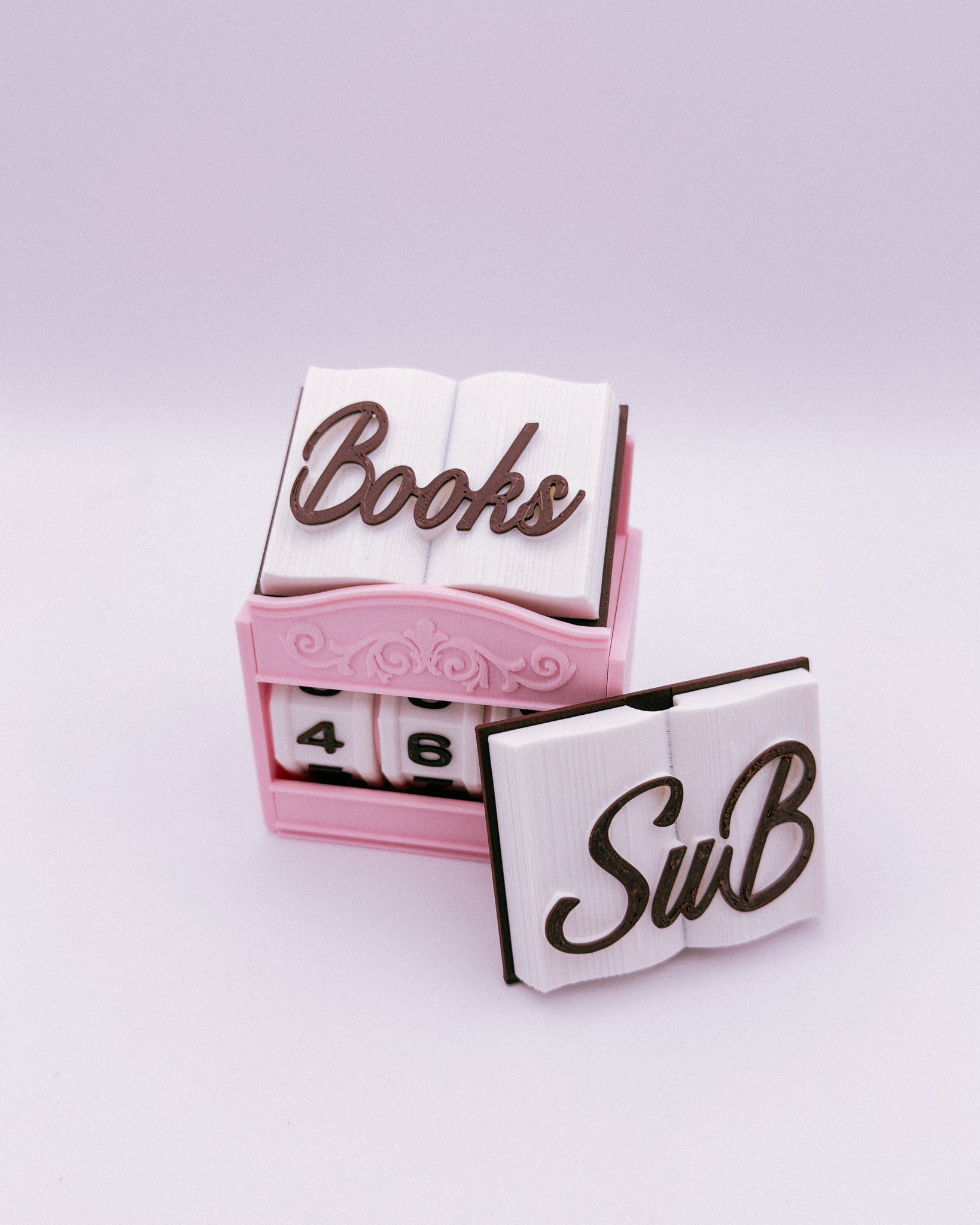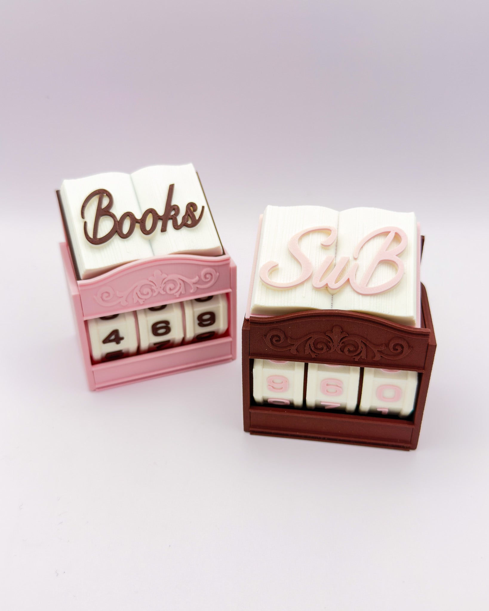 Erhältlich als rosafarbener Counter mit dunkelroten Büchern & Zahlen oder dunkelroter Counter mit rosafarbenen Zahlen & Büchern.